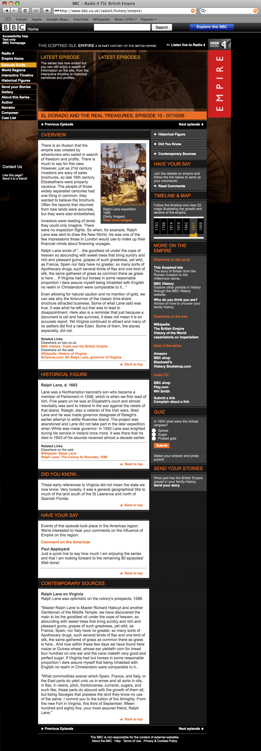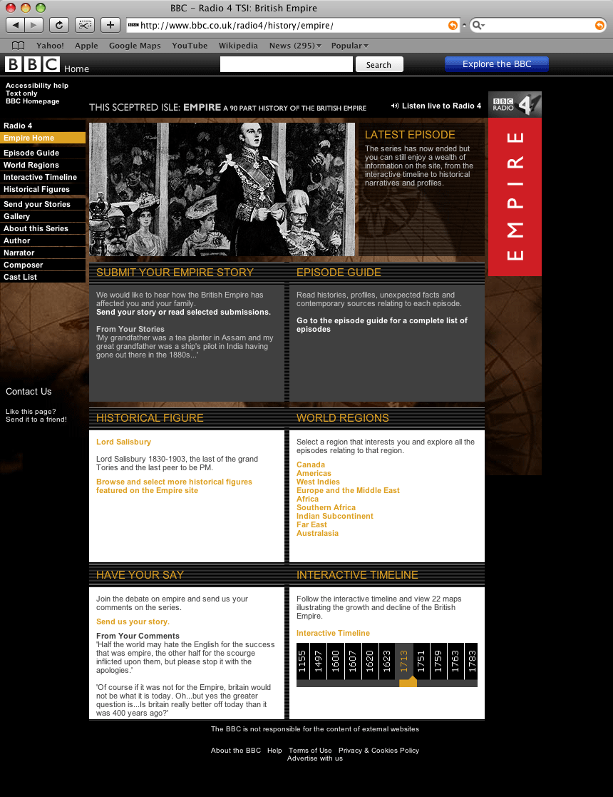 'Empire' was a 90-part radio show about the British Empire, broadcast on BBC Radio 4. The project involved the creation of a website used to supplement the show and give a detailed synopsis of each episode.